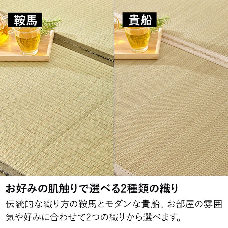 畳の織り方は、い草と経糸を等間隔で織った肌触りがいい伝統的な織り方が特徴の「鞍馬(双目織)」と、織り目が細かく、ベタつきにくいサラッとした質感の織り方の「貴船(目積織)」の2種類から選べます。