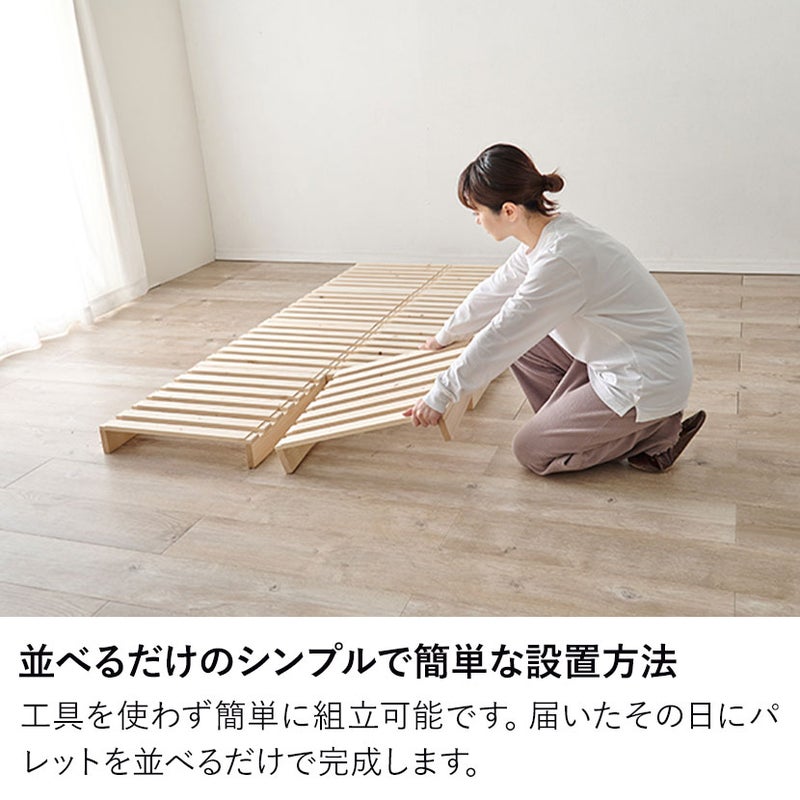工具を使わず簡単に、パレットをお好みの場所に並べるだけであっという間にベッドが完成します。
