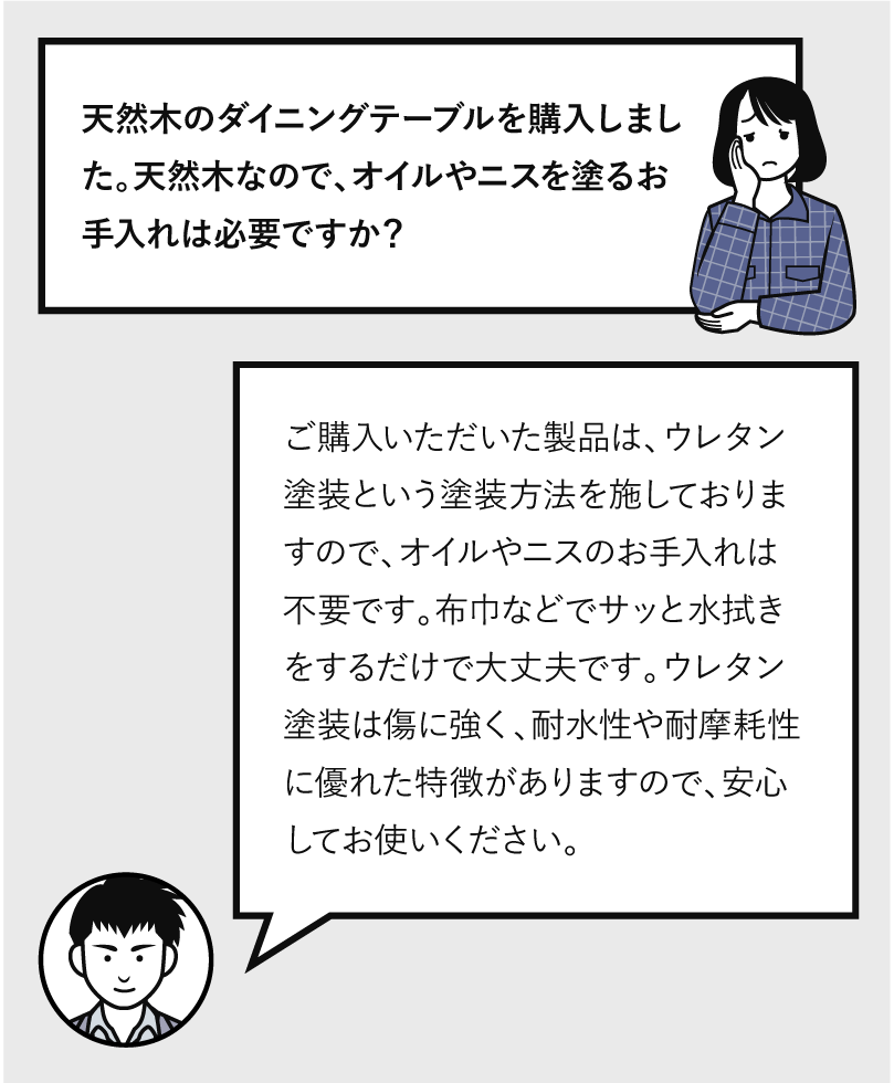 インテリアやコーディネートのご相談はもちろん、家具の材質についての質問や、購入した家具のお手入れ方法など、相談事例は多岐に渡ります。