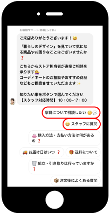 「家具について相談したい」「スタッフに質問」の項目を選ぶと、直接スタッフに相談することができます。