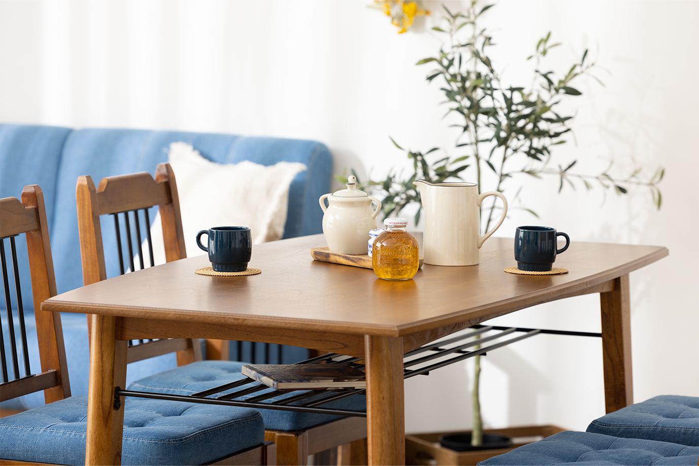天板下に便利な収納棚が設けてある、使い勝手のいいダイニングテーブルです。天板にはワイピング加工を施してあるため、木目が強調され深みのある仕上がりに。すっきりとした見た目でどんなテイストのお部屋にもなじみやすく、2人で使用するのにちょうどいい大きさです。