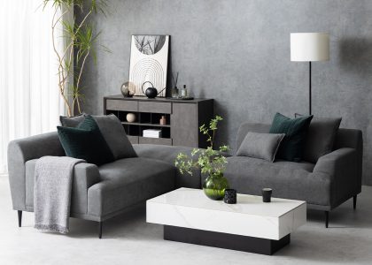 格子デザインがポイントのナチュラルな木とセラミックのグレーが組み合わさった和モダンデザインのリビングダイニングです。フローリングの一角に畳スペースを設け、ローテーブルと座椅子で和室のような空間に。対照的にダイニングスペースは高さのあるテーブルとダイニングチェアを取り入れています。全体的に格子デザインが魅力の家具を使用し、和を感じるインテリアに。ですが、セラミック天板で一気に空間を引き締め、モダンさも感じるようにしました。