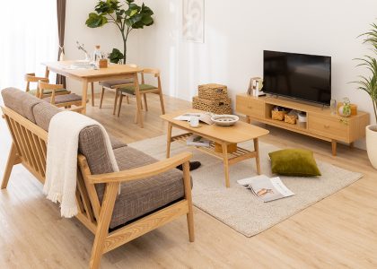 オーク材の色味と美しい木目をメインに、差し色にクールなブラックを用いたコーディネートです。