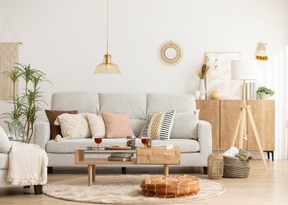 北欧テイストのファブリックソファなど、やわらかい配色のインテリアに差し色を加えることで、スッキリとした雰囲気のナチュラルモダンになります。